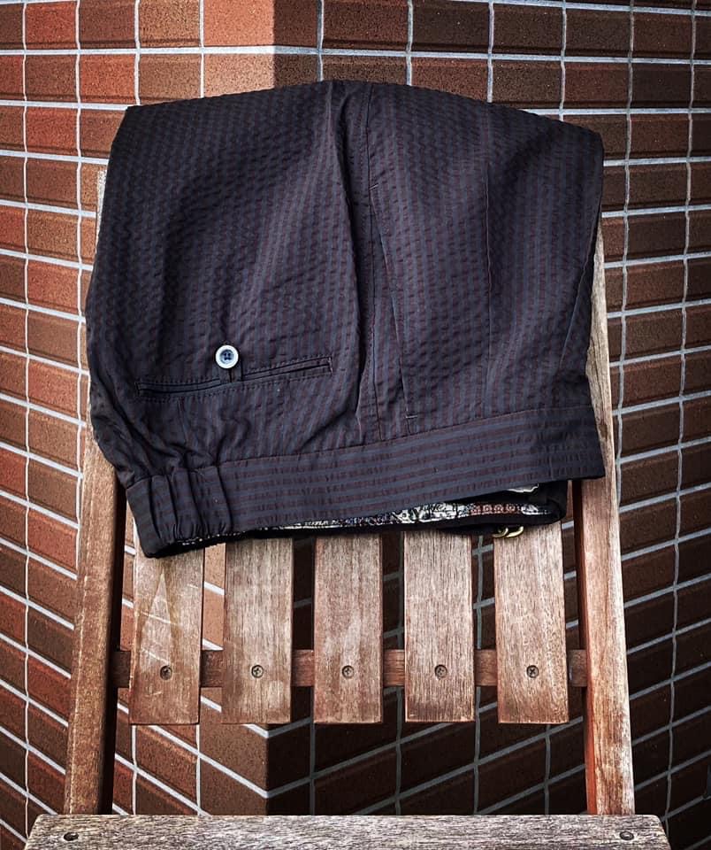 オリーブブラウンのグルカパンツはお馴染みの越前屋モデルの新作です。シアサッカー調のルックスですがコットンとポリエステルを混紡しているので、サラッと軽いタッチ。Tシャツを気軽に着るなら、こんな素材が軽さを演出してくれることがよくわかります。今シーズン、ストライプ柄は久しぶりのトレンド柄。この生地はジャパンエクスクルーシヴで、デザイナーの後藤が「日本人に似合う色柄」として特別にピックアップしたものだそうです。